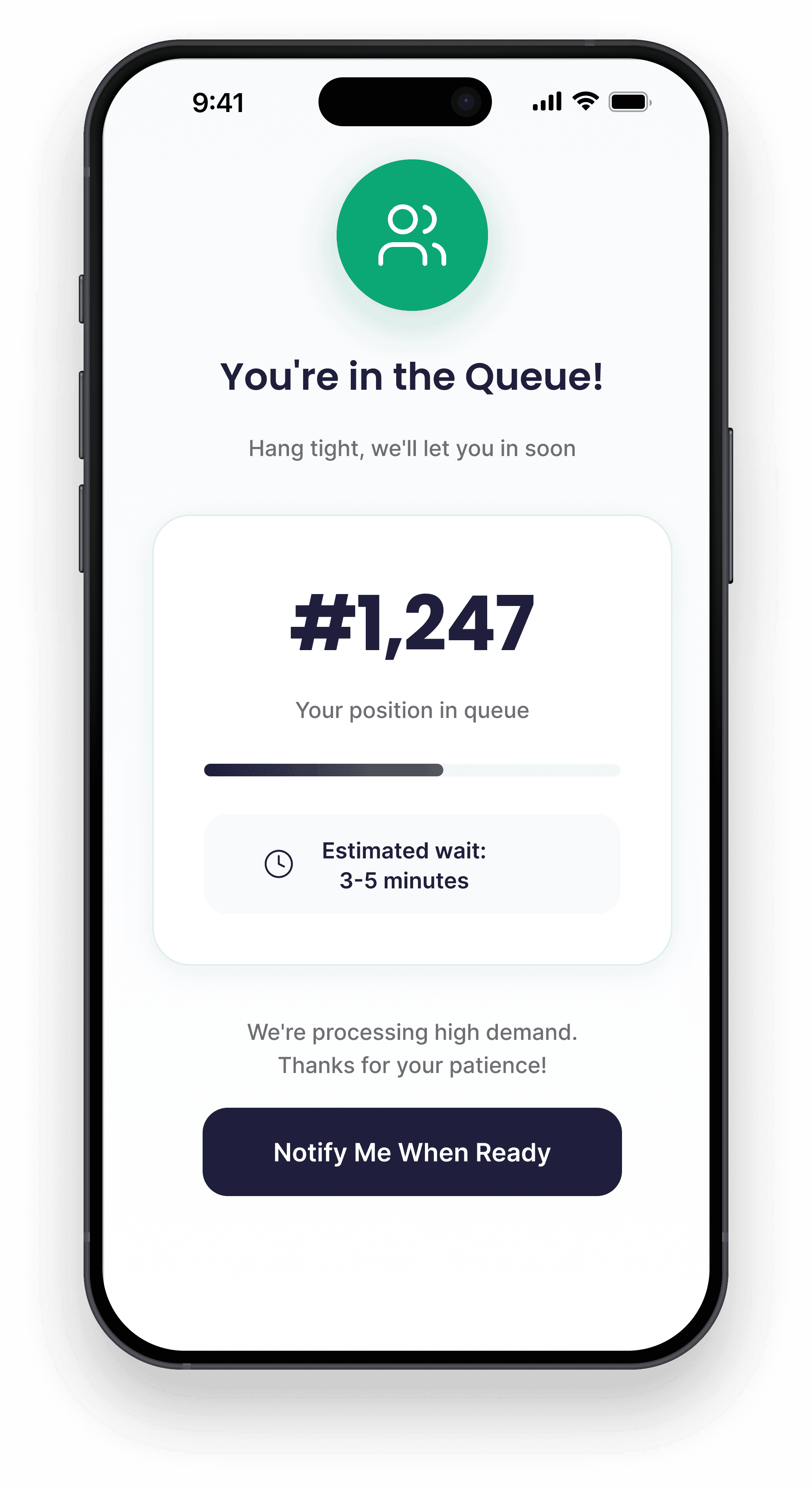A real-time waiting room shows your exact position in line with estimated wait times.